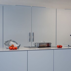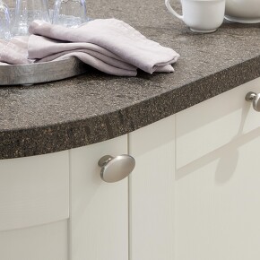Der Samtmatteffekt bei Küchenmöbelfronten wird durch ein besonderes Silikatmineral im Lack erreicht, das durch seine Porosität das einfallende Licht „schluckt“ und deshalb matt und samtig wirkt. Manchmal werden diese Oberflächen auch „pelle di pesca“ (= Pfirsichhaut) genannt. Die Porosität macht diese Oberfläche gegen stark gefärbte Flüssigkeiten wie z.B. Johannisbeersaft, Tomatenketchup oder Rotwein, aber auch Fettspritzer empfindlich. Hier gilt ganz besonders, dass umgehend gereinigt werden muss. Ist der Fleck erst einmal eingetrocknet, kann er meist nicht mehr vollständig entfernt werden. Man kann zwar versuchen, Flecken mit einer weichen Bürste und einem milden Haushaltsreiniger zu behandeln, aber meist ohne großen Erfolg. Mit aggressiveren Mitteln oder Scheuermittel wird die Oberfläche aufpoliert und es entsteht ein hässlicher Glanzfleck.