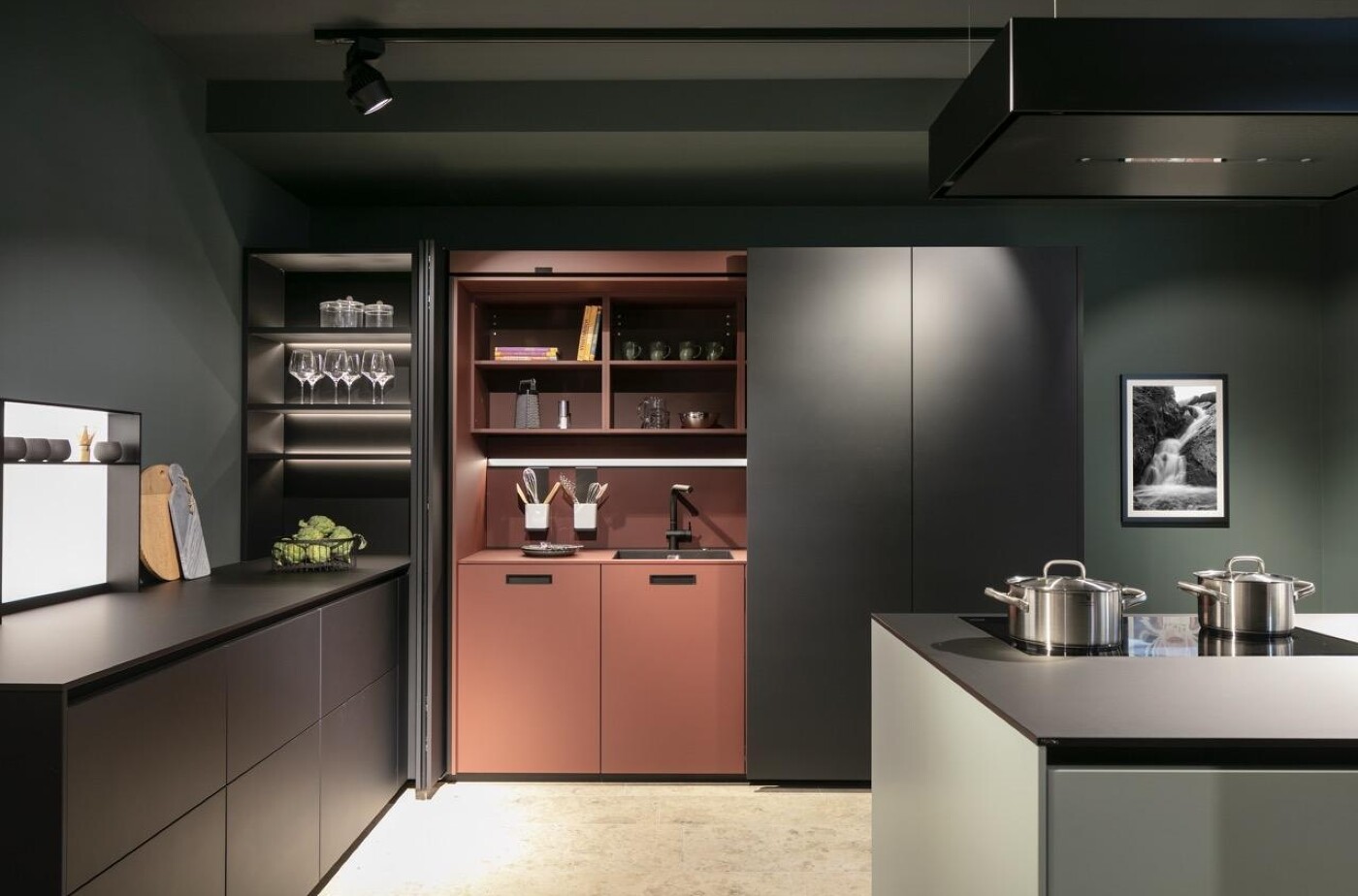 Der Clou: Die Schiebetüren sind zugleich Falttüren, und nicht nur das – sie lassen sich ihrer gesamten Länge nach in einen eigens dafür frei gelassenen Spalt zwischen den Küchenschränken parken. Die Tür ist damit aus dem Bewegungsbereich und die Möbelzeile komplett zugänglich.