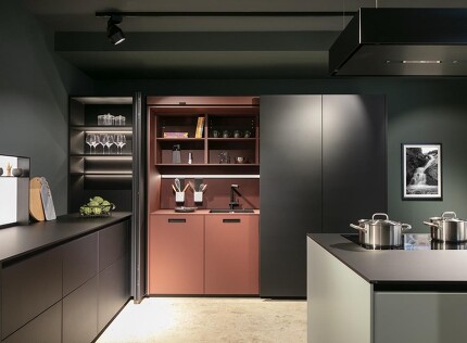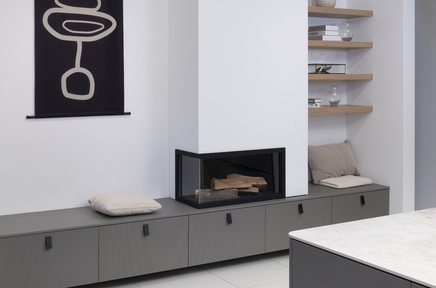 Auch ohne Kamin supergemütlich: Sitzbänke in der Küche. Und hier mit einem Add-on, das sich wirklich auszahlt: jede Menge Stauraum. Hinter den Klappen lassen sich Küchenutensilien, Vorräte, Geschirr oder kleine Elektrogeräte den Blicken entzogen, aber griffbereit verstauen.