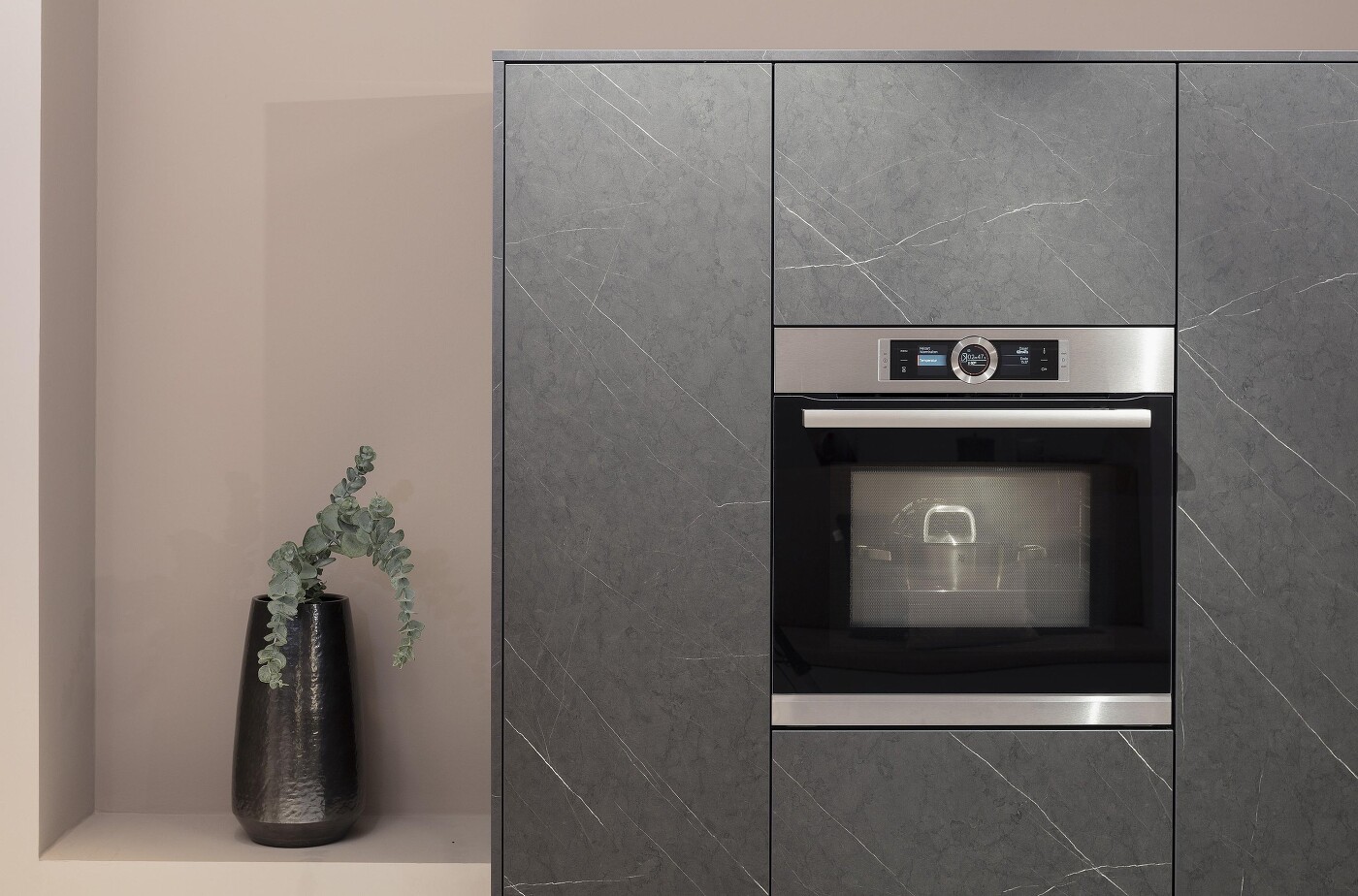 Sie überlegen gerade, in welcher Farbgebung Sie Ihre neue Küche gestalten möchten? Oder geht es zur Zeit darum, die Wände in Ihrer Küche neu zu streichen, und die vorhandenen Küchenfronten sind bereits in Grau gehalten? Dann ziehen Sie unbedingt auch diese Wandfarbe in Erwägung: Altrosa. Es passt deswegen so gut zu jedem Grauton – ob uni oder Steindekor – weil Altrosa selbst Grauanteile enthält. Deswegen harmoniert es so schön mit grauen Fronten. Mehr als das hat die Kombination von Grau und Altrosé sehr viel Stil und Klasse, strahlt Eleganz aus und zugleich Weichheit und Wohnlichkeit. Einbaugeräte mit Edelstahlfronten machen sich sehr gut dazu wie das gezeigte Küchenbeispiel mit dem im Highboard eingebauten Backofen zeigt.