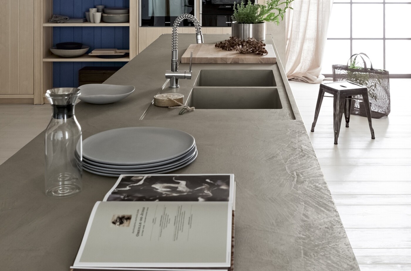Beton ist wieder in Mode – auch in der Küche. Arbeitsplatten und ganze Küchenblöcke aus Sichtbeton geben der Küche das gewisse Etwas. Und jedes Stück aus echtem Beton ist ein Unikat! Achten Sie bei der Auswahl darauf, dass die Oberfläche poliert wurde, damit die Poren geschlossen sind. Denn Beton ist zwar kratzfest, wasserfest, hitzebeständig und pflegeleicht, durch die poröse Oberfläche aber auch anfällig für Flecken. Deshalb sollte man die Oberfläche auch regelmäßig wieder versiegeln – am besten mit Öl oder Naturwachs. Aber Tipp: Es gibt auch Fronten und Arbeitsplatten in Betonoptik. Nicht so schwer, aber ebenso gut aussehend!
