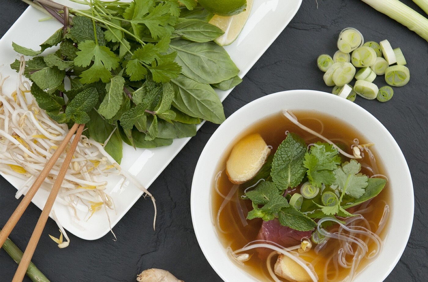 Pho wird im Land der Drachen sogar zum Frühstück gegessen. Die vietnamesische Nudelsuppe besteht aus einer kräftigen Rinderbrühe mit Rinder- (Pho Bo) oder Hühnerfleischstückchen (Pho Ga). Auch ein paar Spritzer Fischsauce sind enthalten, Reisnudeln, Frühlingszwiebeln, Koriandergrün, Minze und frische Sprossen.