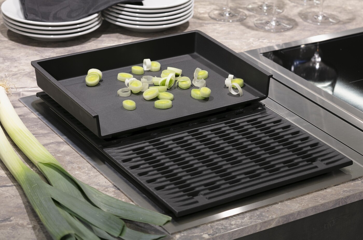 Wenn auch Sie in dieser Art braten möchten, haben wir eine gute Nachricht für Sie: Es gibt Kochfeld-Systeme, bei denen eine Teppanyaki-Platte bereits integriert ist. Dazu empfehlen wir einen leistungsstarken, aber leisen Dunstabzug oder eine Muldenlüftung.