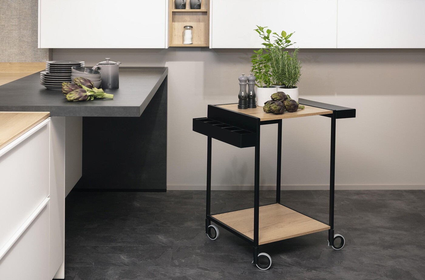 Schon gemerkt? – Die einstigen Teewagen sind längst wieder zurück, und das in den unterschiedlichsten Ausführungen: ganz offen oder auch mit Schubladen oder Schranktüren. Ideal, wenn so ein Teewagen sein eigenes „Carport“ unter der Arbeitsplatte bekommt, denn dann ist er schnell hervorgeholt und genauso schnell wieder aus dem Weg gerollt.