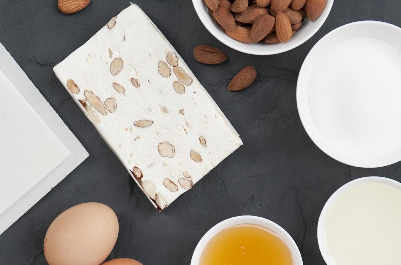 In Italien heißt es Torrone, in Frankreich und bei uns Nougat: ein Konfekt aus Honig, Zucker, Eiweiß und Mandeln. Kochen Sie 100g Honig, 80g Glukosesirup, 250g Zucker und 100 ml Wasser so lange ein, bis eine zähe Masse entsteht. Parallel schlagen Sie 2 Eiweiß sehr steif. Rühren Sie die heiße Honigmasse langsam in den Eischnee und schlagen Sie diesen dann nochmals mindestens 20 Minuten auf. Am Ende kommen 300g ganze, geschälte und geröstete Mandeln dazu. Streichen Sie die Masse auf Oblaten, bedecken Sie das Ganze wieder mit Oblaten und lassen Sie es abkühlen.